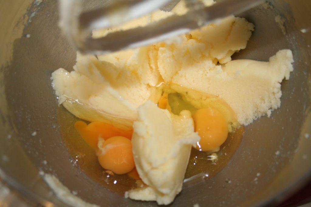 Mélanger le beurre et le sucre jusqu’à obtenir une crème puis ajouter les oeufs entier.