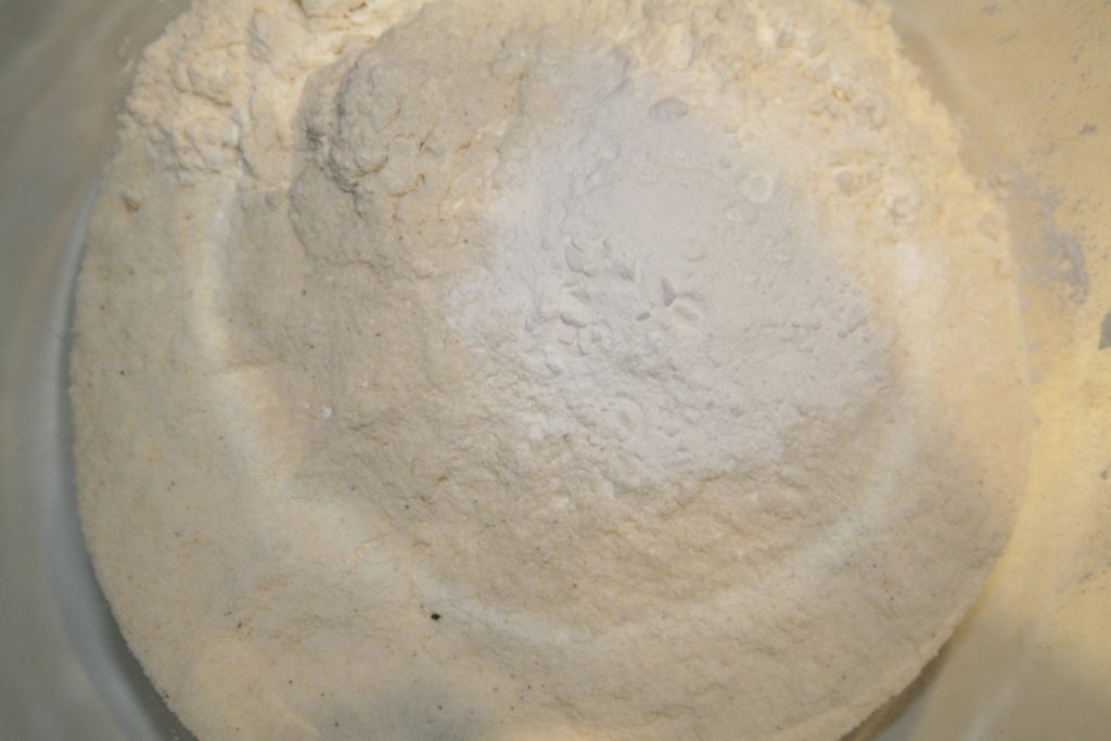 Mettre dans un autre bol la farine de blé, la farine de maïs et la levure chimique. Bien mélanger.