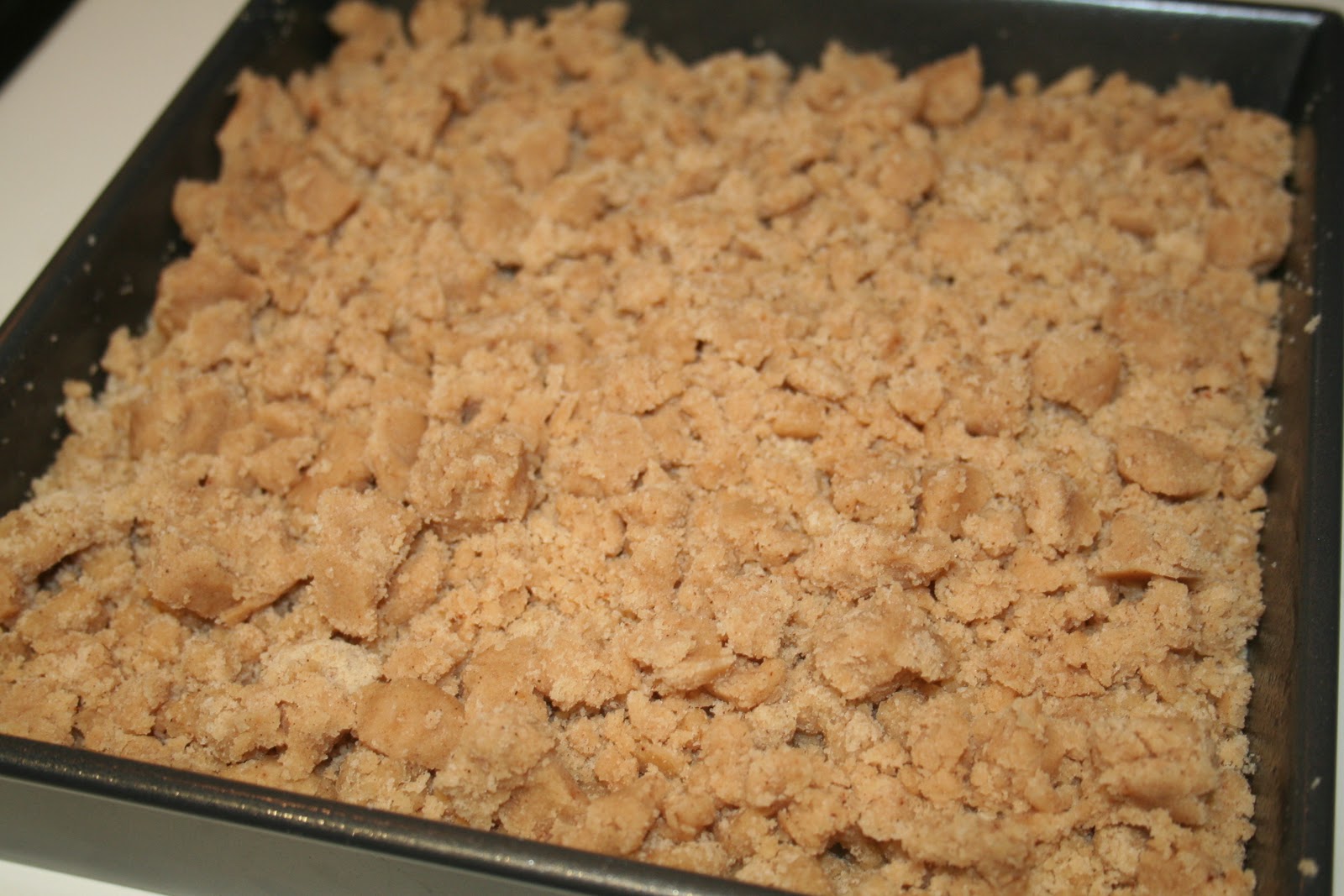 Verser la pâte à crumble sur le gâteau.