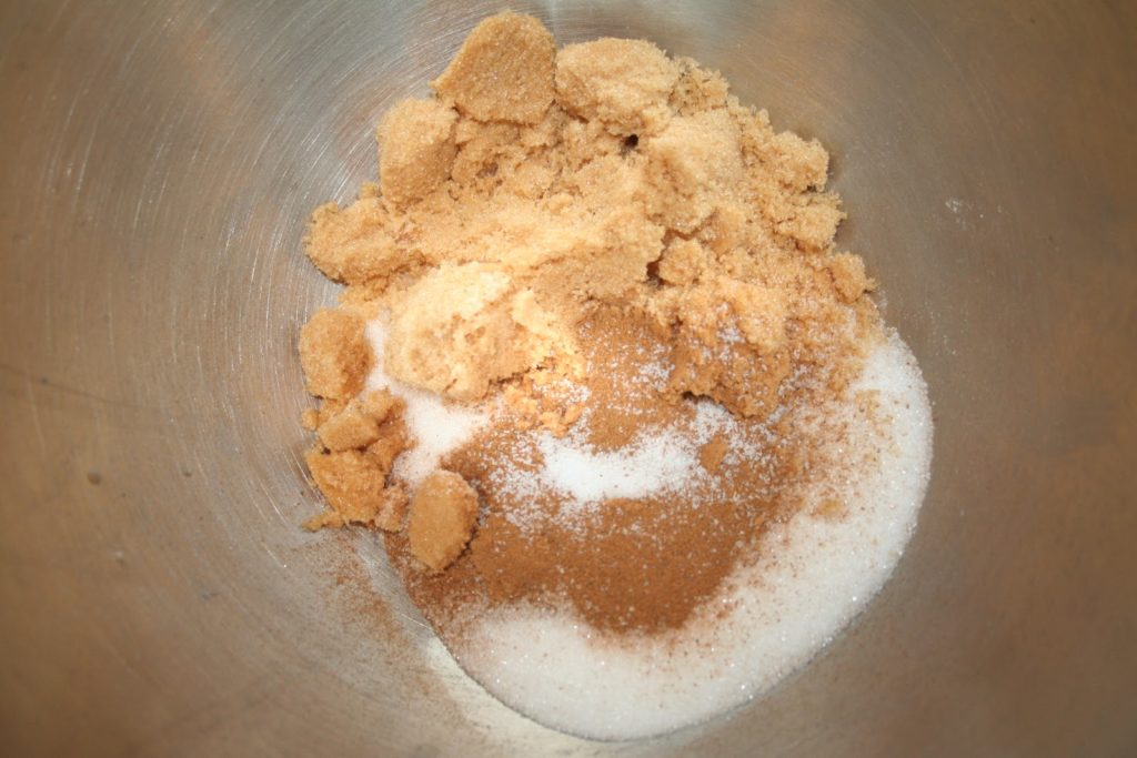 Préparer la pâte à crumble. Mettre les deux sucre, le sel et la cannelle dans le bol du robot.