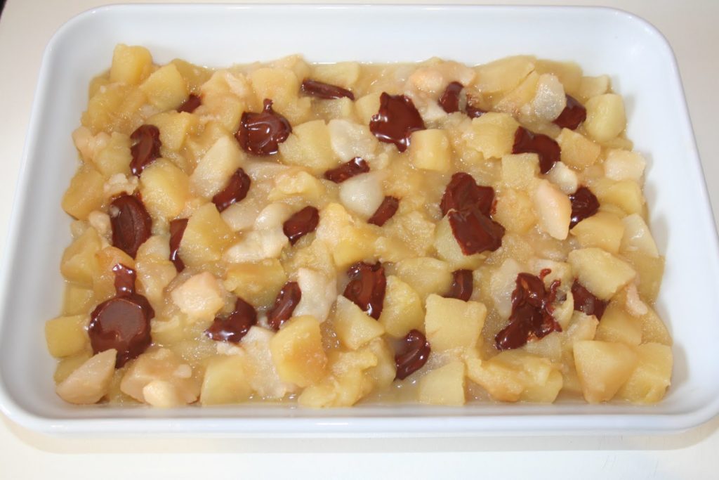 - Une fois que les fruits sont cuits, les verser dans un plat à gratin. Parsemer de morceaux de chocolat. On peut mettre ce que l’on veut, mais mieux vaut ne pas trop en ajouter car le crumble risque d’être un peu écoeurant…