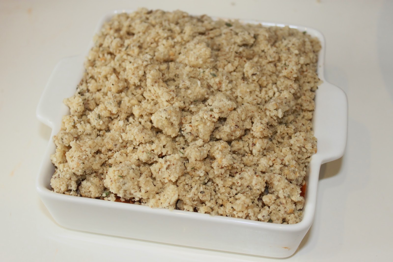 Pour le crumble: mélangez la farine, le sucre, la chapelure, la poudre de noisette et le parmesan.