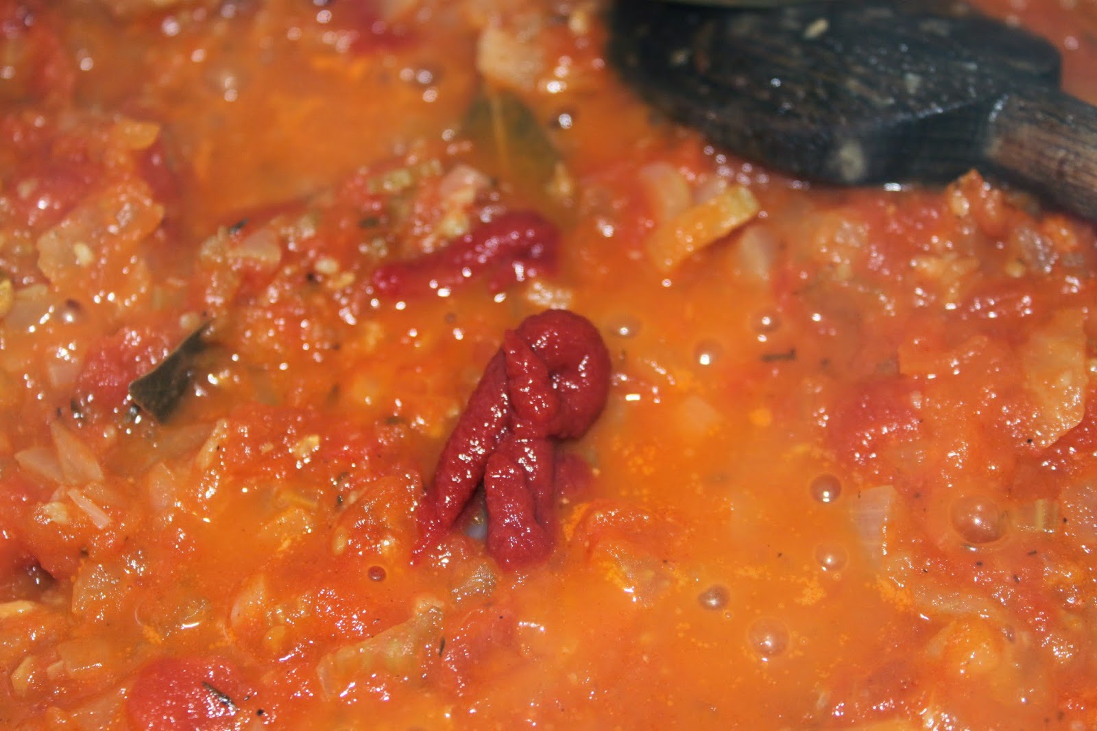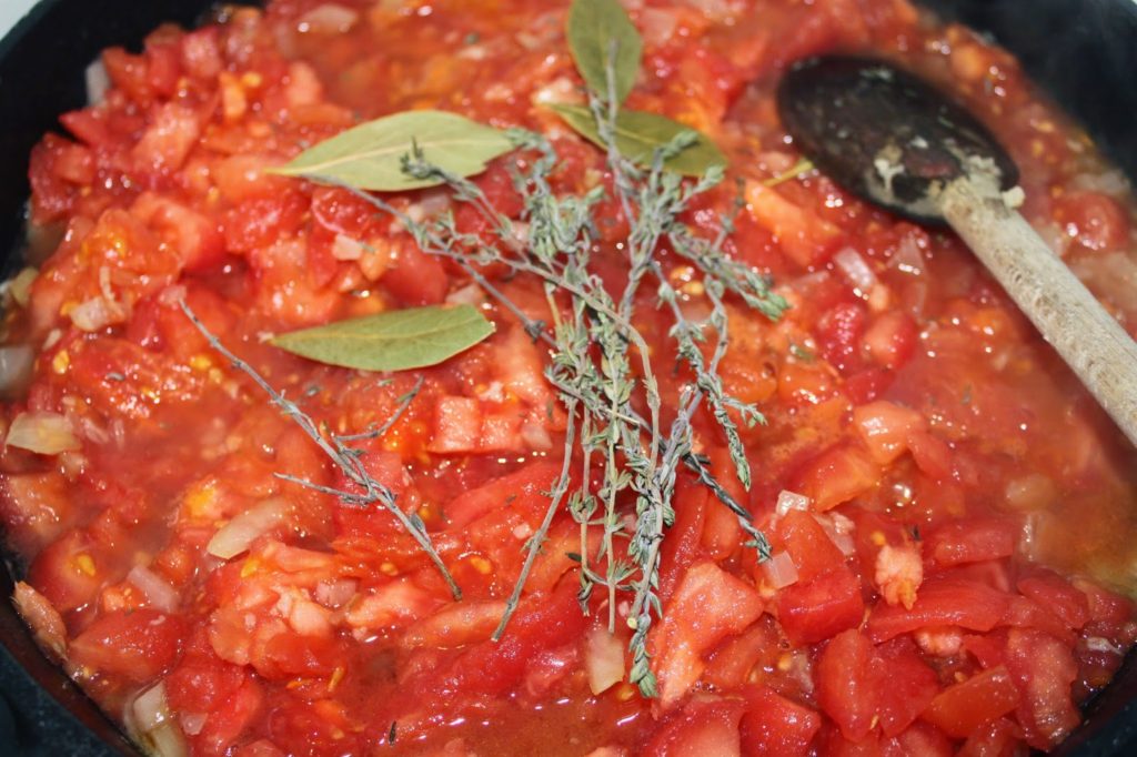 - Les tomates doivent être bien cuites. Ajoutez le double concentré de tomates et laissez cuire de nouveau sans couvercle jusqu’à ce que le tout ne rende presque plus de jus.