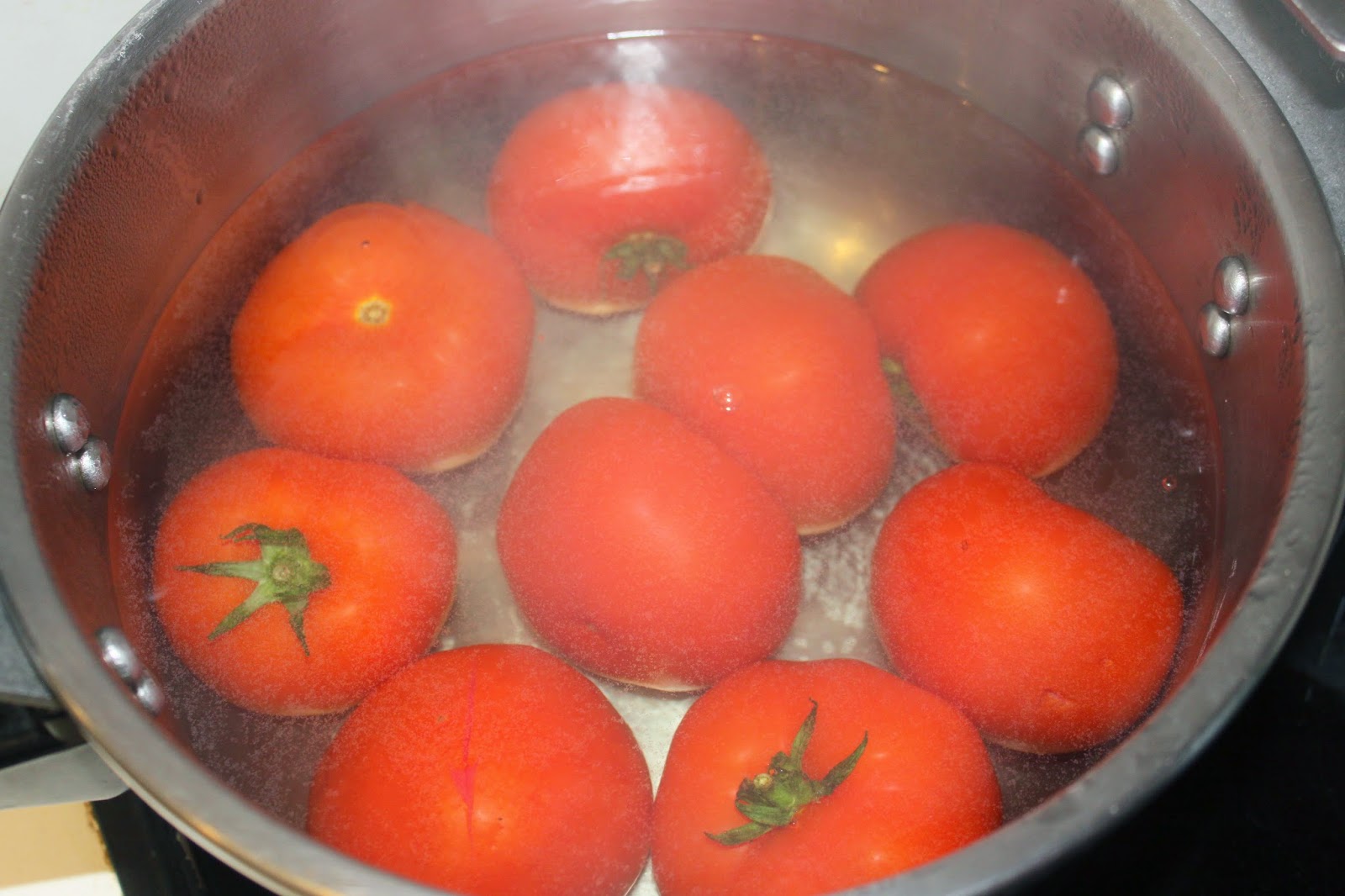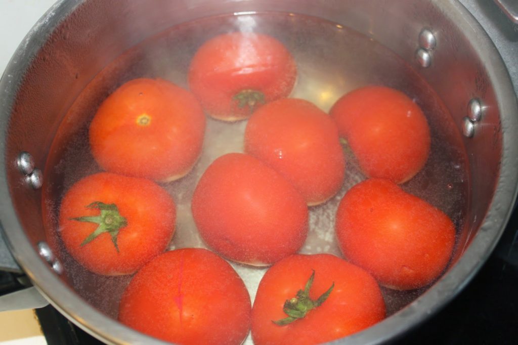 - Plongez les tomates 1 minute dans l’eau bouillante puis mettez-les dans l’eau froide pour ensuite les peler.