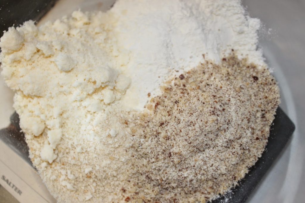 - Pour le crumble: mélangez la farine, le sucre, la chapelure, la poudre de noisette et le parmesan.