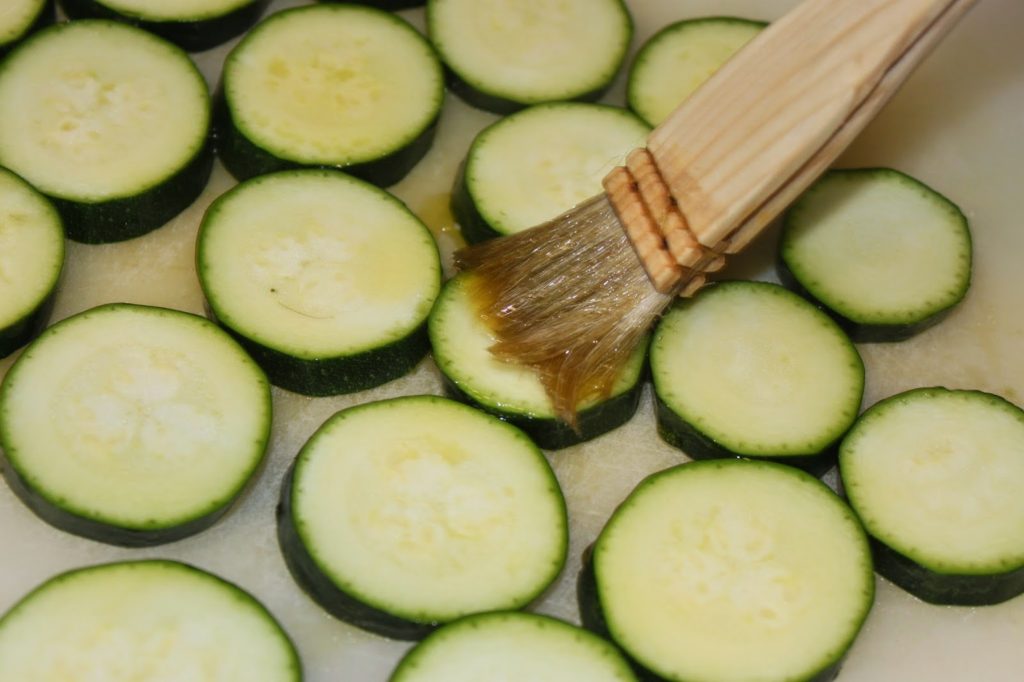 - Coupez les courgettes en tranches et badigeonnez-les d’huile d’olive.