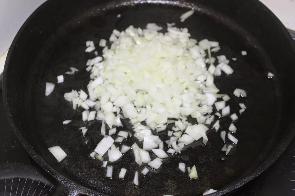 - Hachez finement l’oignon et mettez-le dans une poêle (ici ma nouvelle Skeppshult !! ) avec l’huile d’olive sur feu modéré.