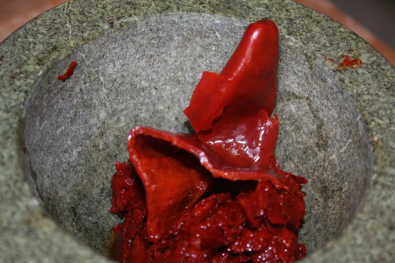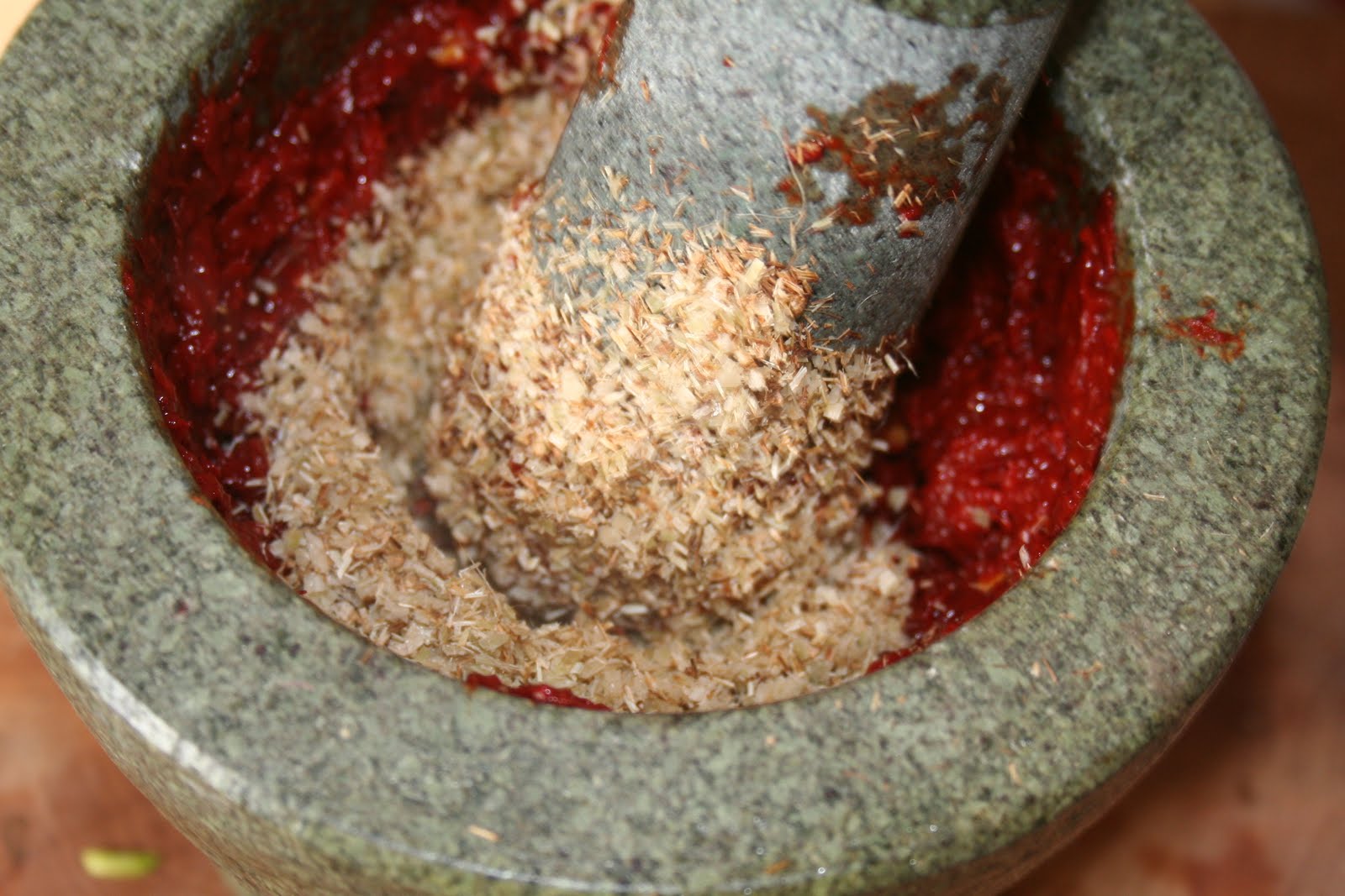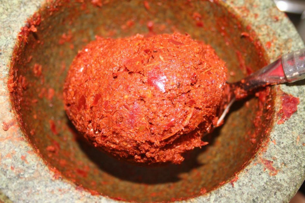 - Cela peut prendre du temps suivant la qualité des piments.Conseil de Bernard: on peut tout à fait se simplifier la tâche et les mixer d’abord pour ensuite les mettre au mortier et continuer le travail à la main.