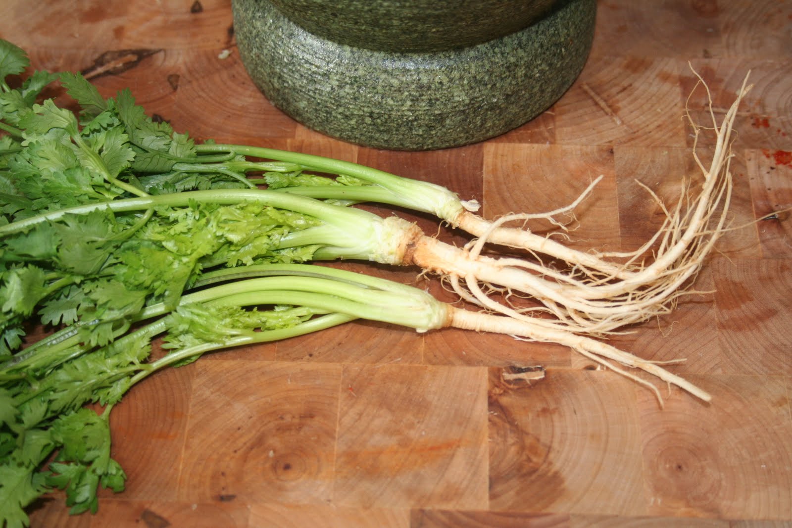 - Laver les racines de coriandre. Sur la photo il y en a 3 car j’ai dû préparer un curry géant pour un diner! Mais sinon c’est bien une seule racine pour la recette.Conseil de Bernard: la coriandre avec la racine se trouve chez Tang ou dans les épiceries asiatiques. On peut tout à fait couper les racines et les congeler pour en faire d’autres currys ensuite.