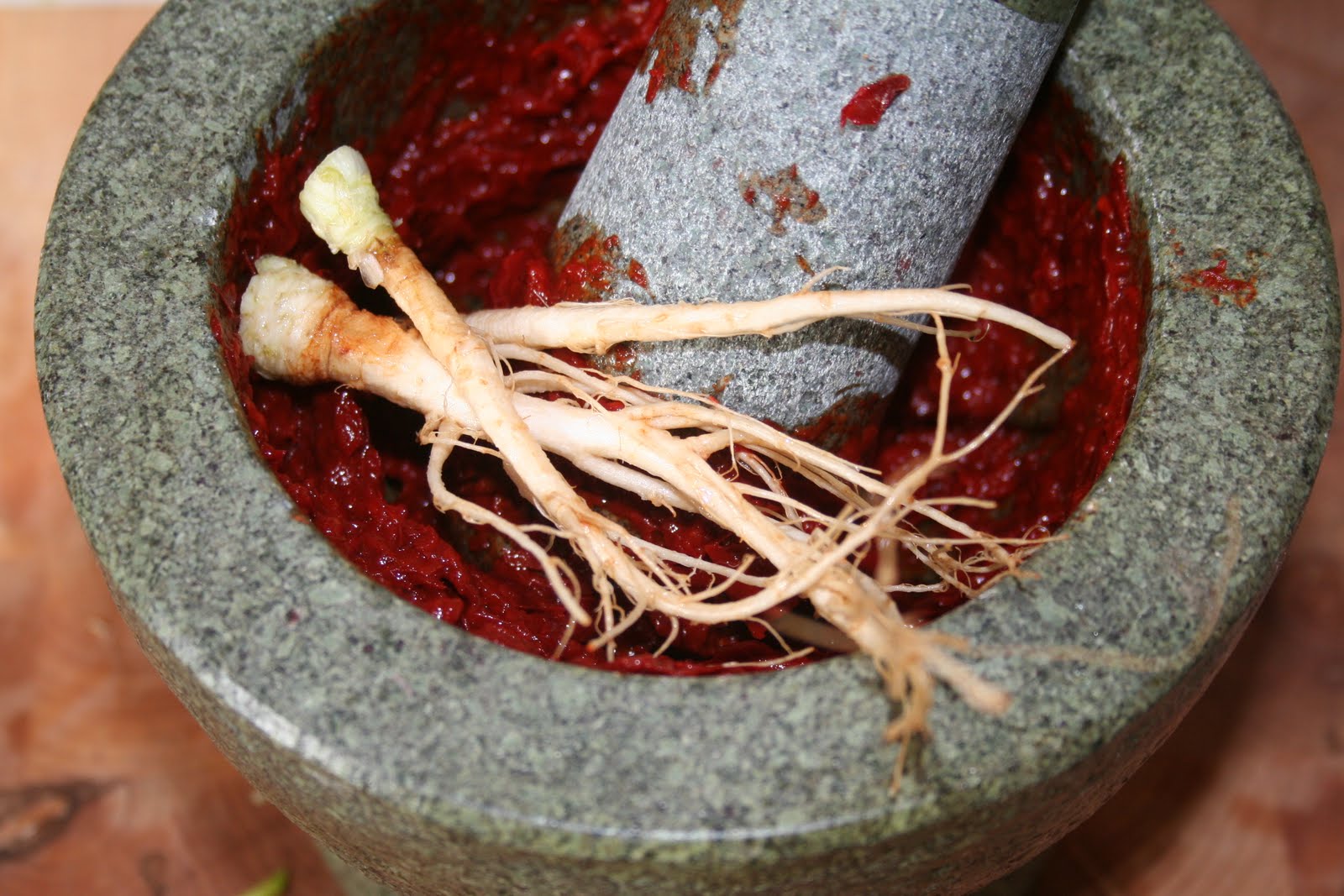 - Ajouter la racine de coriandre et bien écraser avec le pilon.