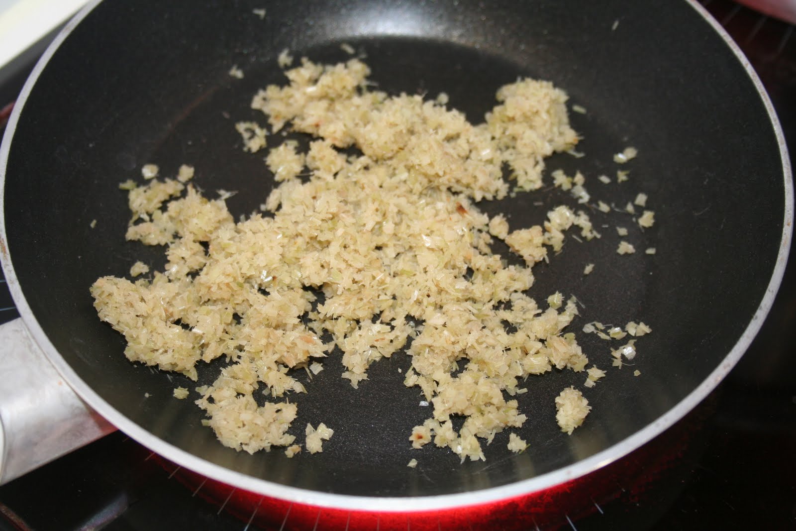 - Mettre la citronnelle hachée dans une petite poêle Elle se trouve en paquet surgelé déjà hachée. Ce qui ets sans doute plus simple d’utilisation. La mettre sur feu doux et laisser sécher et griller légérement la citronnelle.