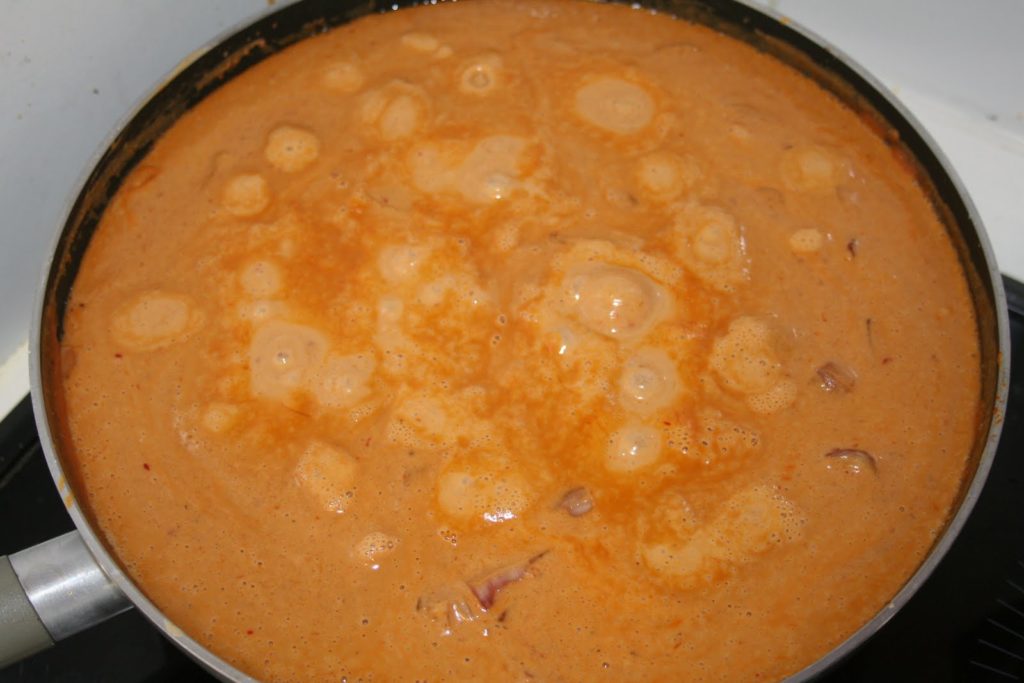 - Faire chauffer l’huile dans un wok Ajouter la pâte de curry et laisser frire un peu jusqu’à ce qu’elle absorbe le gras. La pâte est terminée, elle peut se conserver ainsi dans une boite au frais plusieurs jours, voir semaines.