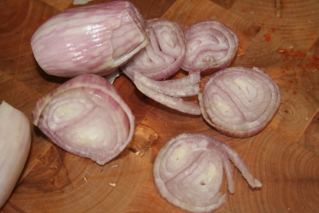 - Les échalotes coupées en fines lamelles.