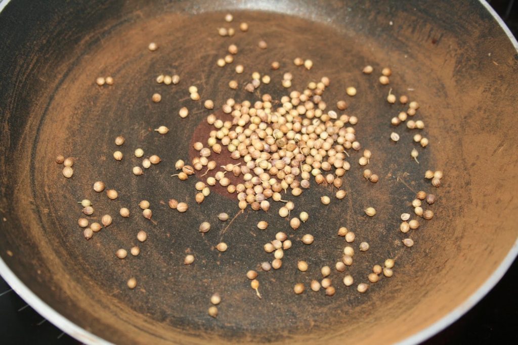 - Faire griller les graines de coriandres. Pour les réduire en poudre, j’ai enlevé la pâte de curry en cours de préparation et j’ai écrasé les graines dans le mortier ainsi vide, puis rajouter la pâte.