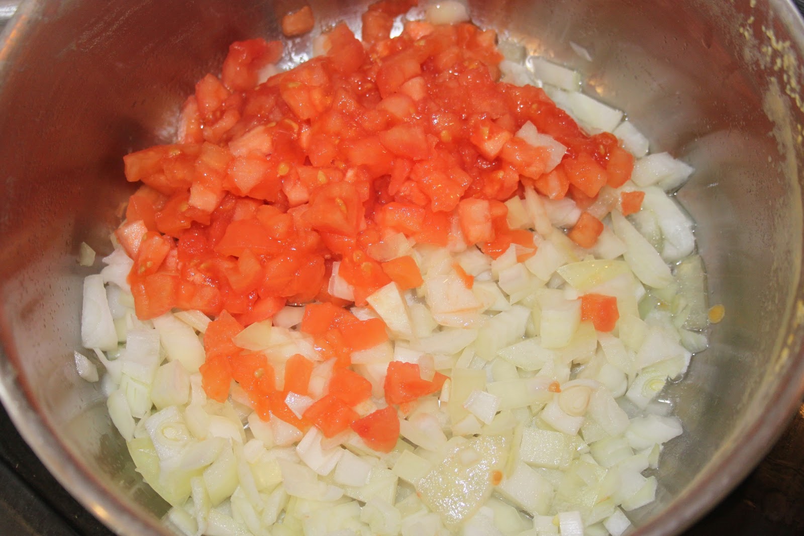 - Mettre l’huile dans une casserole sur feu assez fort, ajouter l’ail écrasé, les tomates et l’oignon.