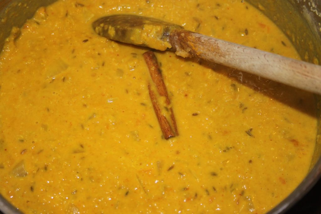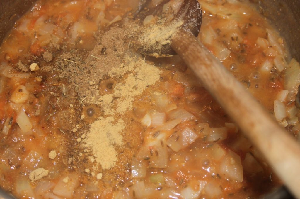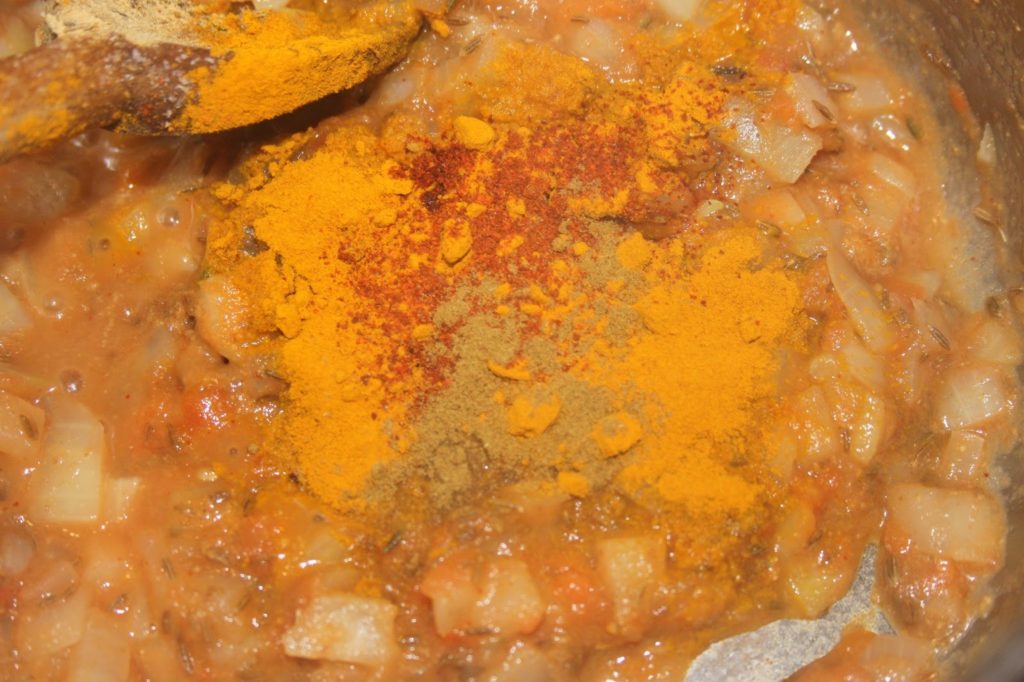 - Quand les tomates fondent un peu, ajouter un peu d’eau pour éviter que le fond ne brûle puis ajouter les épices : gingembre, cumin en poudre le bâton de cannelle…