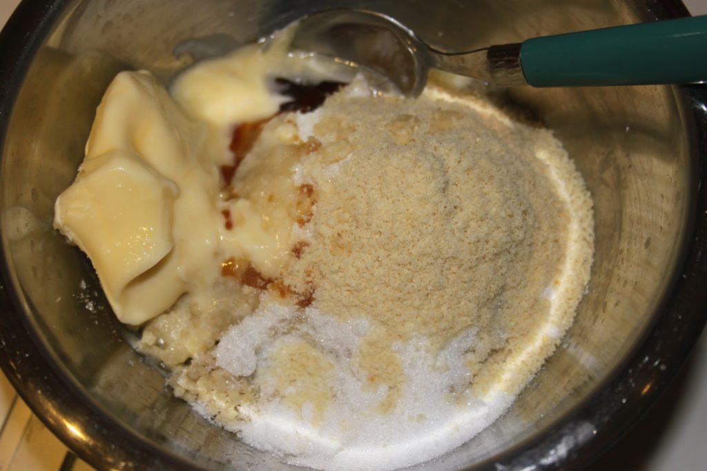 - Mettre la purée de châtaignes dans un bol, ajouter le sucre, la vanille, le beurre mou et la poudre d’amandes.