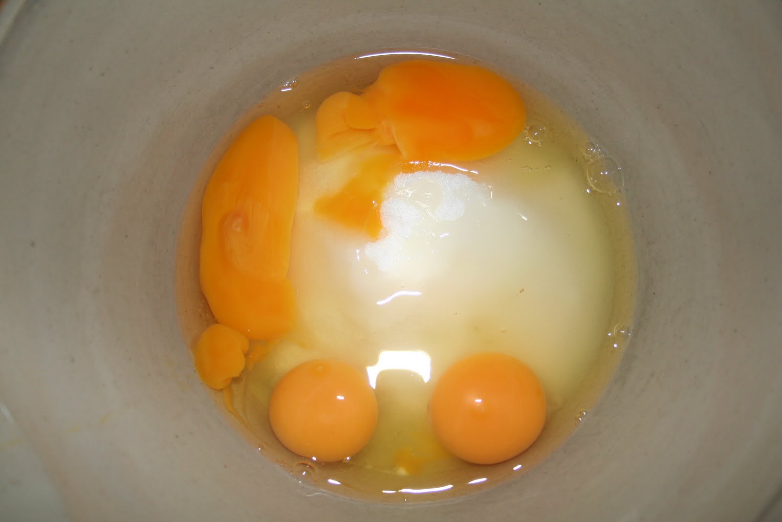 - Préchauffer le four à 160°C.Mettre le sucre et les œufs entiers dans une jatte. Les mélanger au fouet.