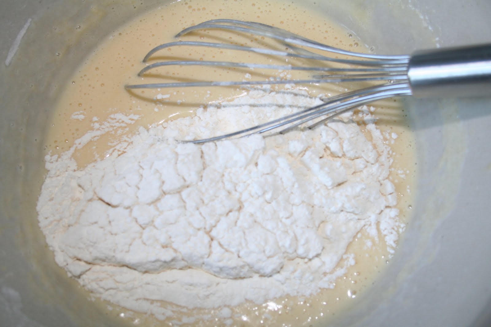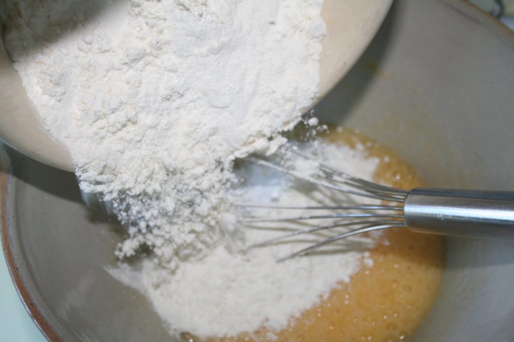 - Ajouter la moitié de la farine et bien mélanger pour éviter les grumeaux.