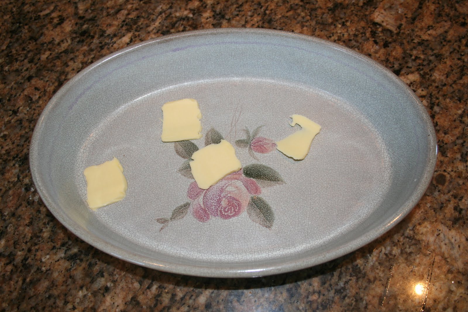 - Mettre environ un tiers des 50g de beurre salé dans un plat en terre cuite.