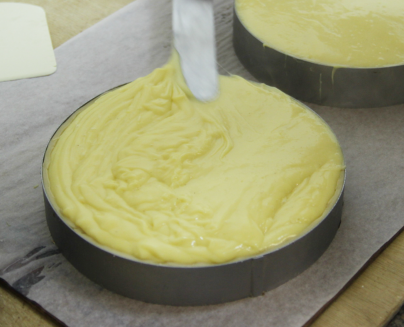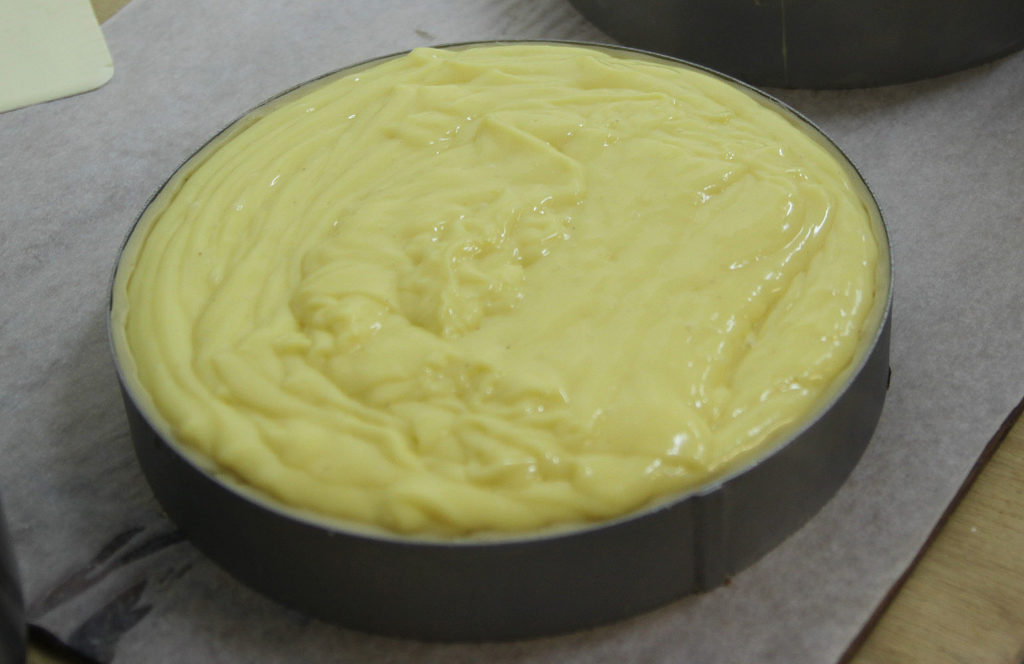 Verser l’intégralité de la crème dans le cercle foncé (foncé = garni de pâte).