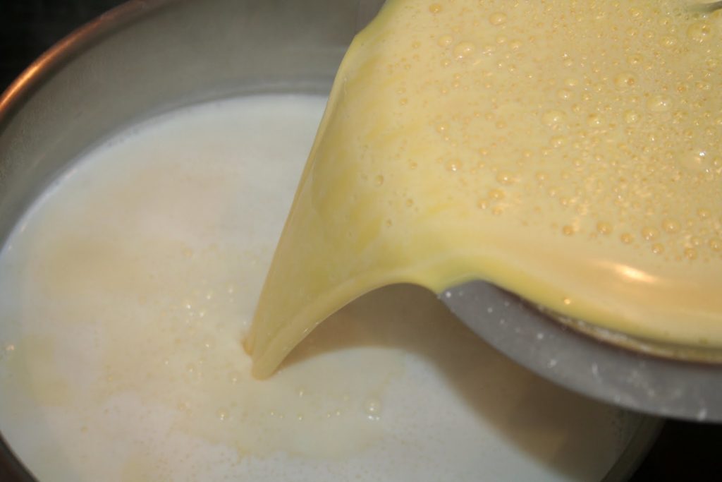 - Et reverser ce mélange dans la casserole dans le reste de lait chaud.