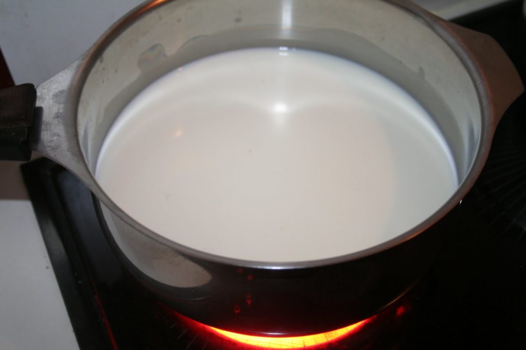 - Faire bouillir le lait avec l’autre moitié du sucre et le beurre.