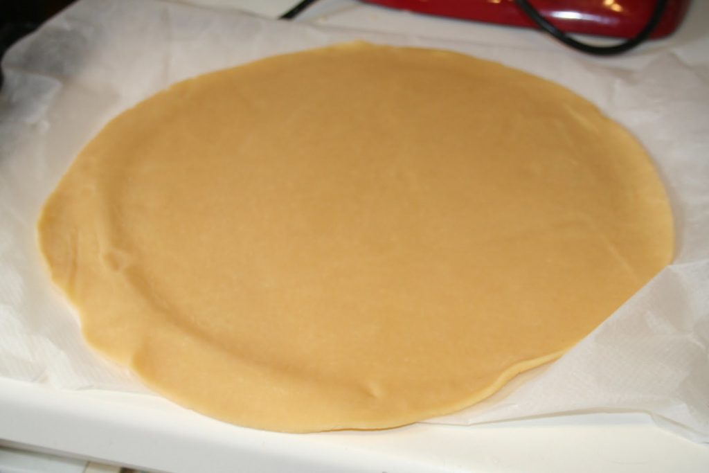 Note de Bernard:suite à la remarque de certains lecteurs, j’ai diminué la quantité de sel dans la pâte. De plus la pâte n’ pas besoin de plus de farine. Si elle est trop malléable, la mettre au frais sous film étirable. Puis l’étaler entre deux papiers sulfurisés.