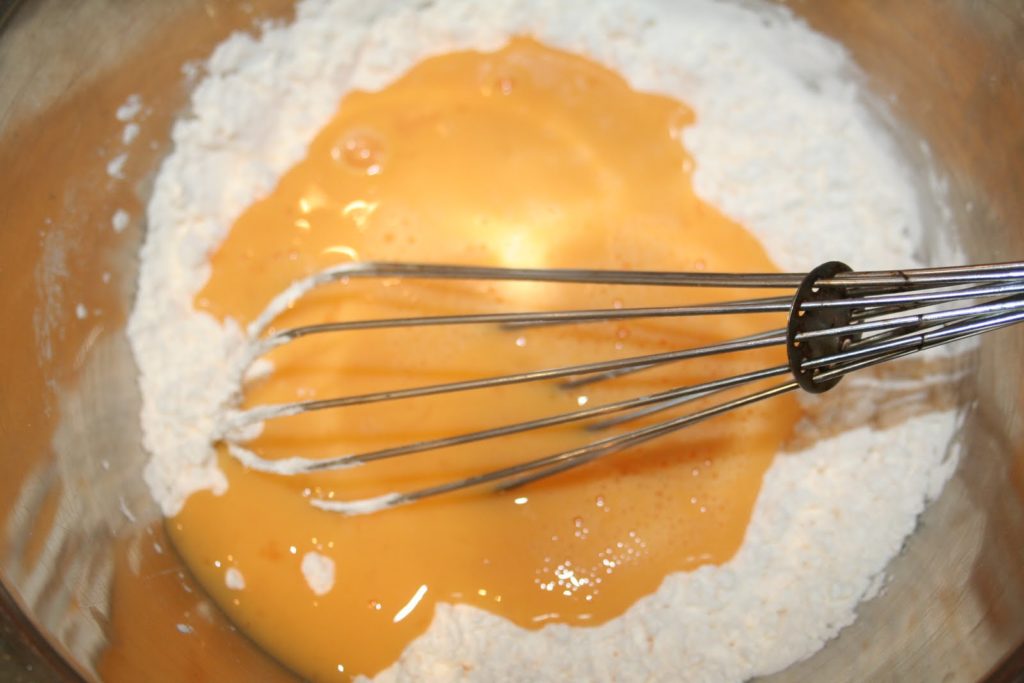 - Ajouter les œufs pesés (il suffit de les battre ensemble puis de peser ce mélange!).