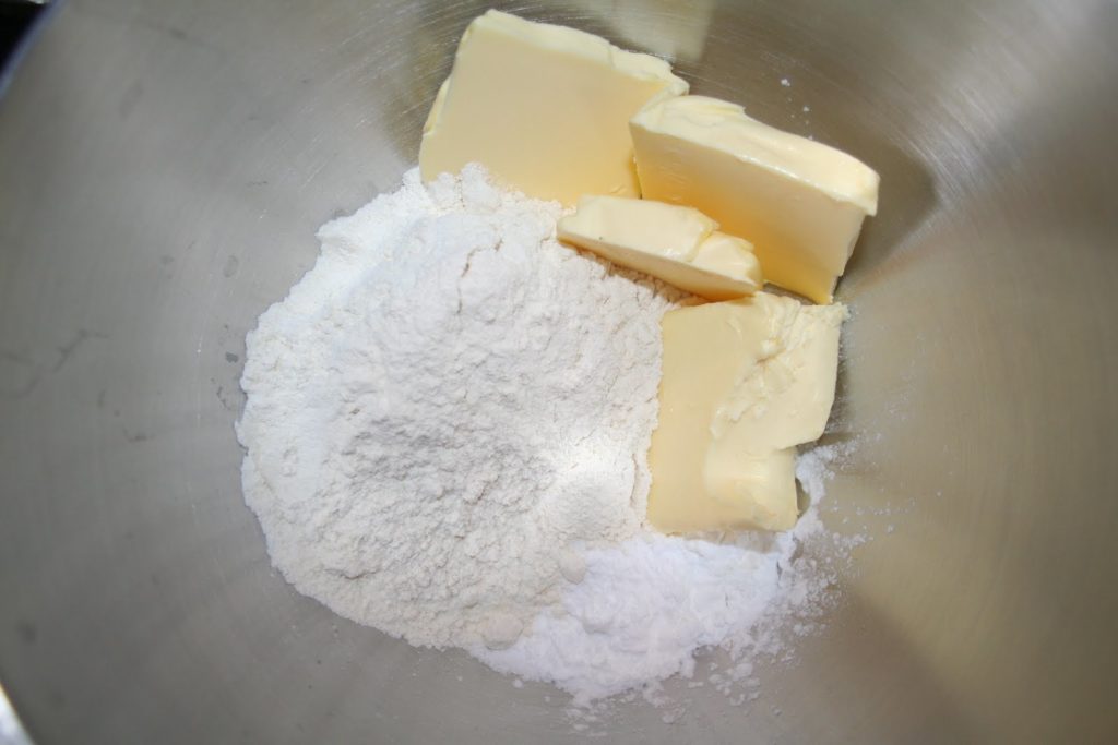 - Préparer la pâte fécule: Mettre le beurre froid coupé en morceaux, la farine, la fécule, le sel et le sucre dans un bol de robot.