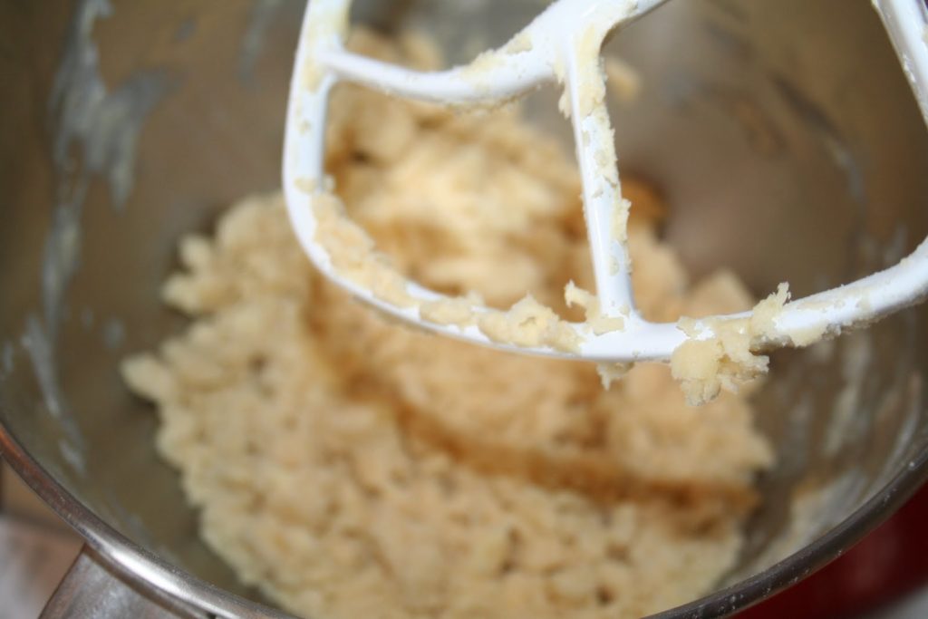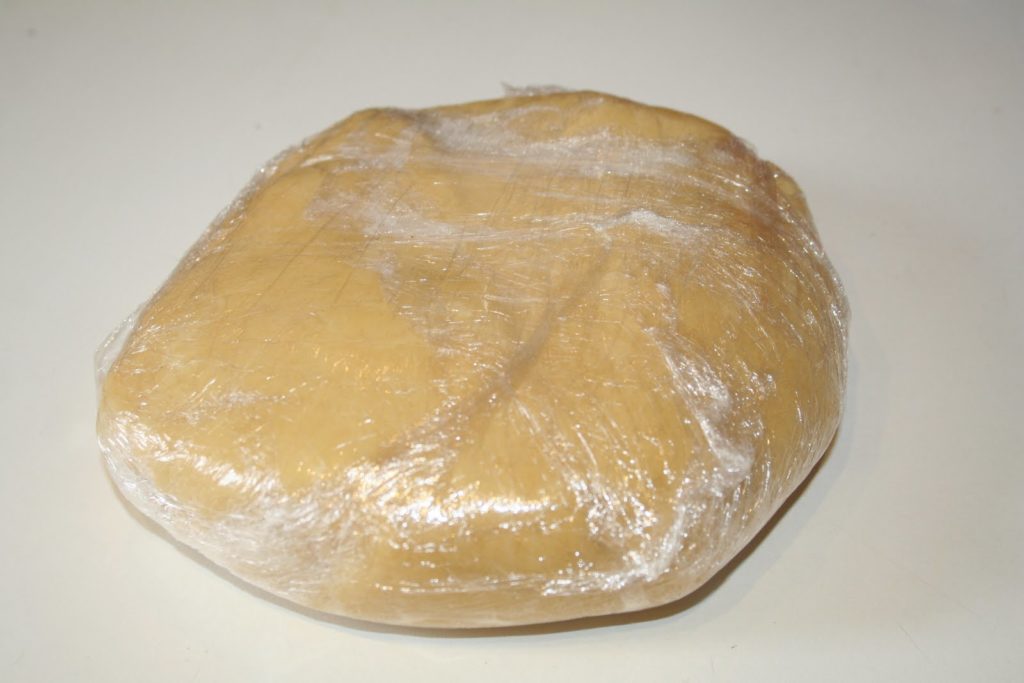 Verser sur le mélange sableux et mélanger jusqu’à ce que le pâte soit homogène. Comme d’habitude, il ne faut pas insister. Mettre la pâte sous film étirable et la mettre trente minutes au frais si il fait chaud. Sinon on peut étaler tout de suite!