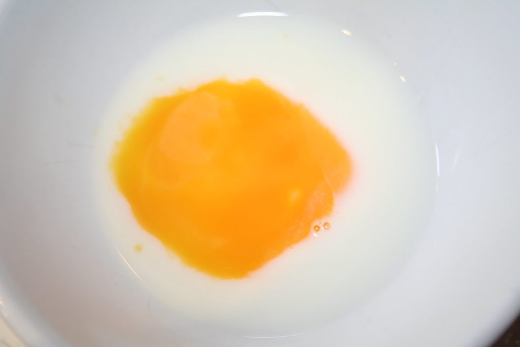 - Mélanger dans un petit bol le lait et le jaune d’oeuf.