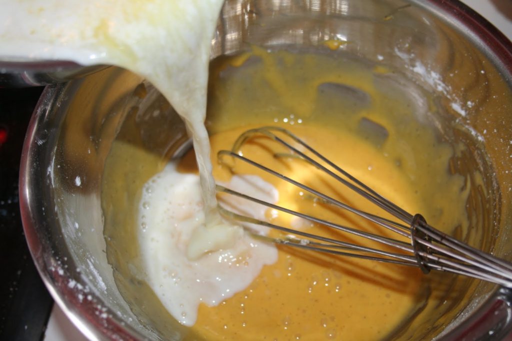 - Et procéder comme pour la crème pâtissière. Verser une petite quantité du liquide bouillant sur le mélange aux œufs.
