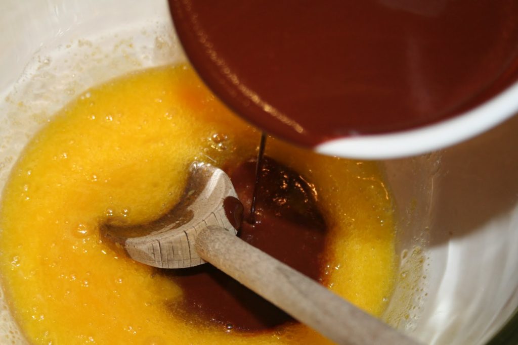 - Ajouter le mélange chocolat/beurre (mais pas chaud, à peine tiède!). Bien mélanger.
