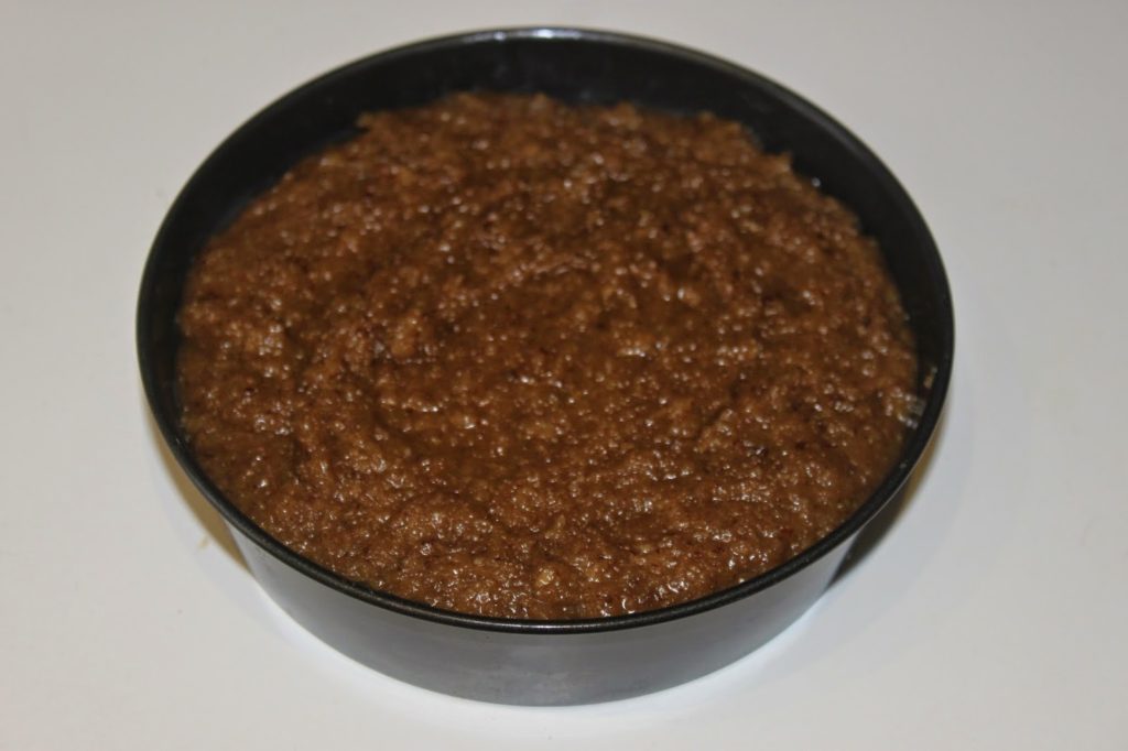 - Beurrez un moule dans le fond duquel vous mettrez un papier sulfurisé. Versez la pâte et mettez dans un four préchauffé à 155°C pendant 45 minutes environ. Je l’ai fait dans un moule de 15cm. Si vous le faites dans un moule de 20cm, multipliez tous les ingrédients par 1,77.