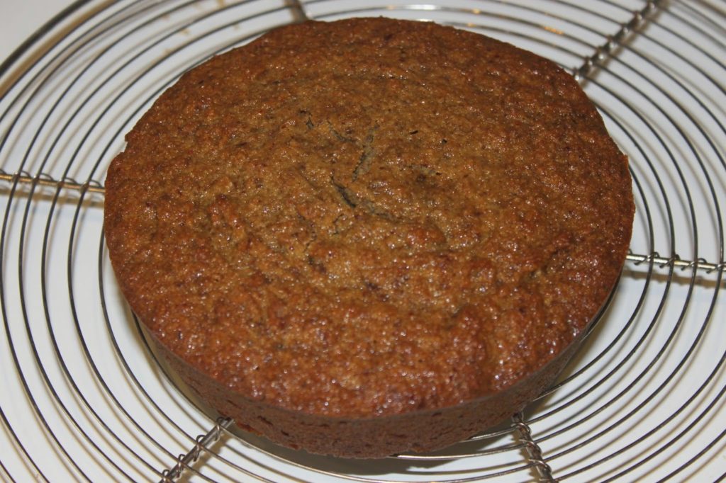 Beurrez un moule dans le fond duquel vous mettrez un papier sulfurisé. Versez la pâte et mettez dans un four préchauffé à 155°C pendant 45 minutes environ. Je l’ai fait dans un moule de 15cm. Si vous le faites dans un moule de 20cm, multipliez tous les ingrédients par 1,77.