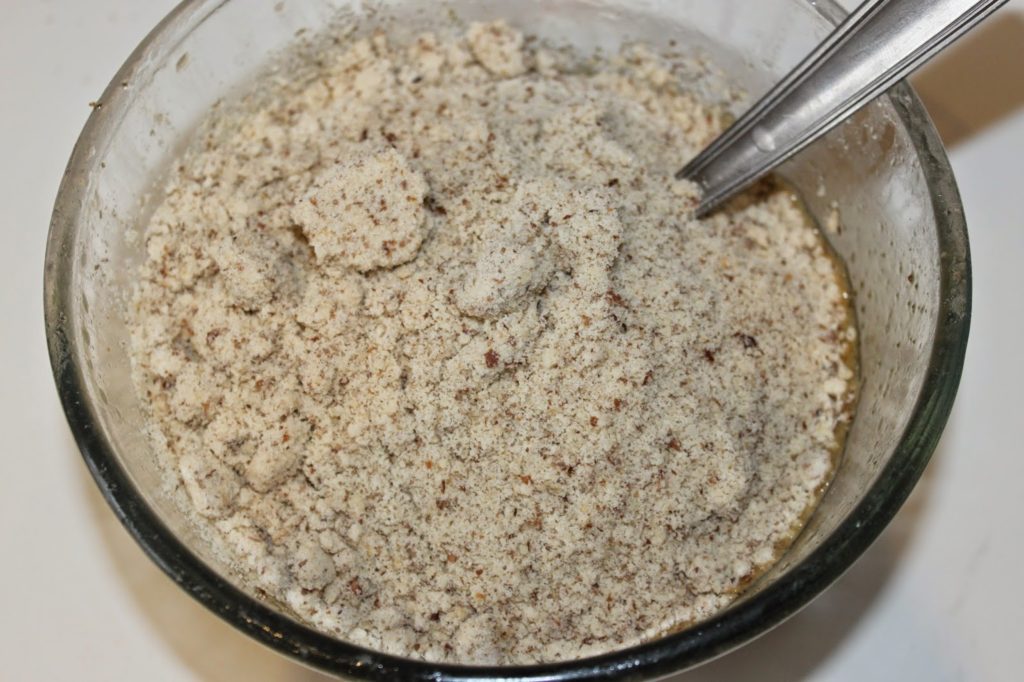 Mélangez bien et ajoutez la poudre de noisette. Vous pouvez mettre moitié amande et moitié noisettes, car les noisettes peuvent être écœurantes quand elles sont seules.