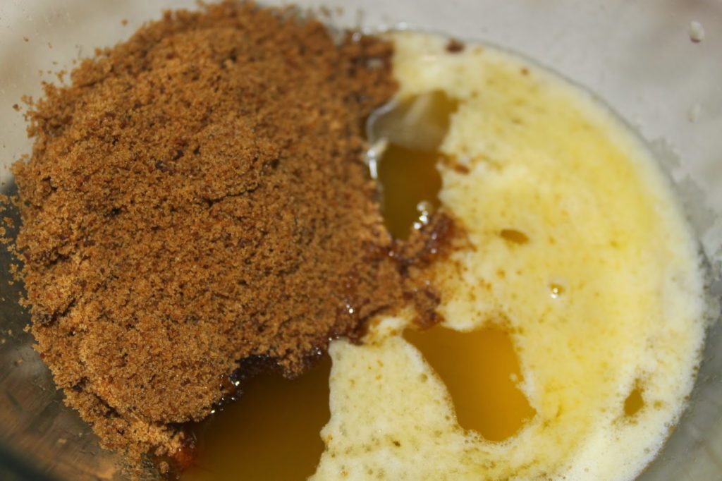 - Faites fondre le beurre demi-sel puis mélangez-le avec le sucre complet de canne, le miel et la vanille.