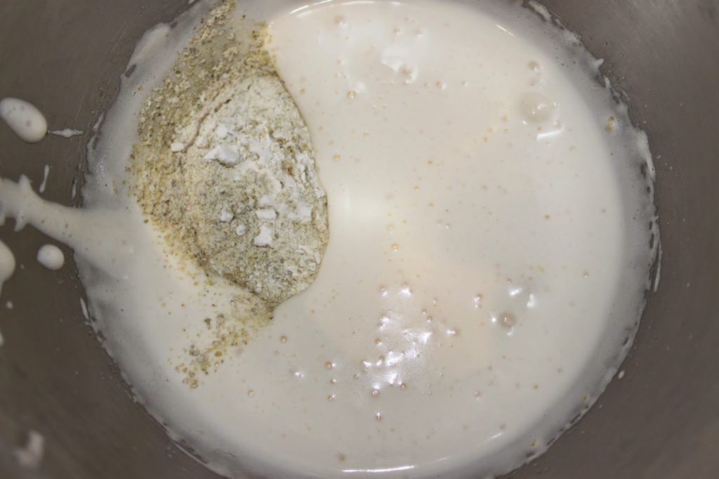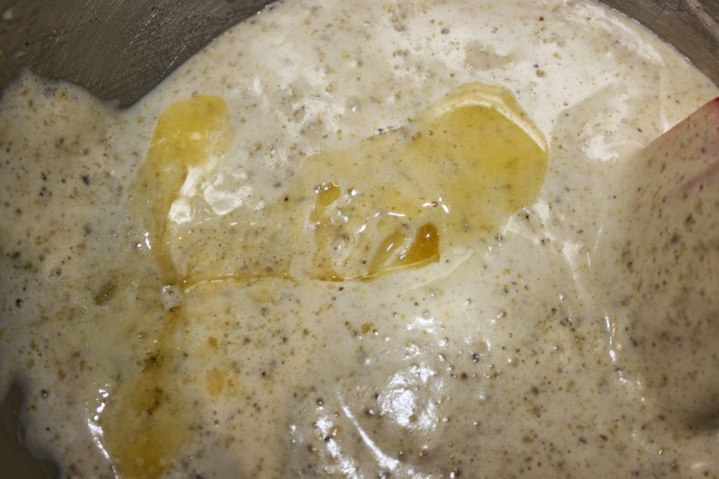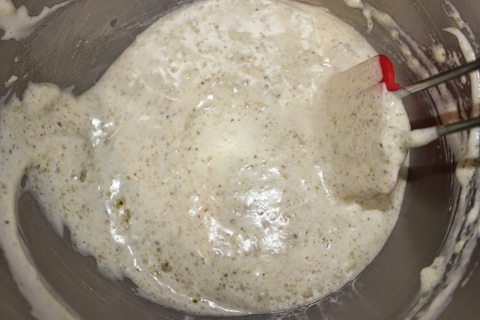 - Quand le mélange est très mousseux, ajoutez le farine/poudre de pistache.