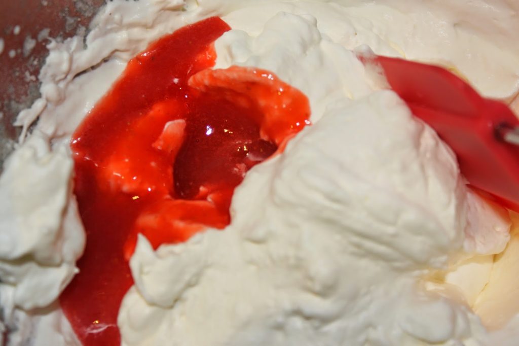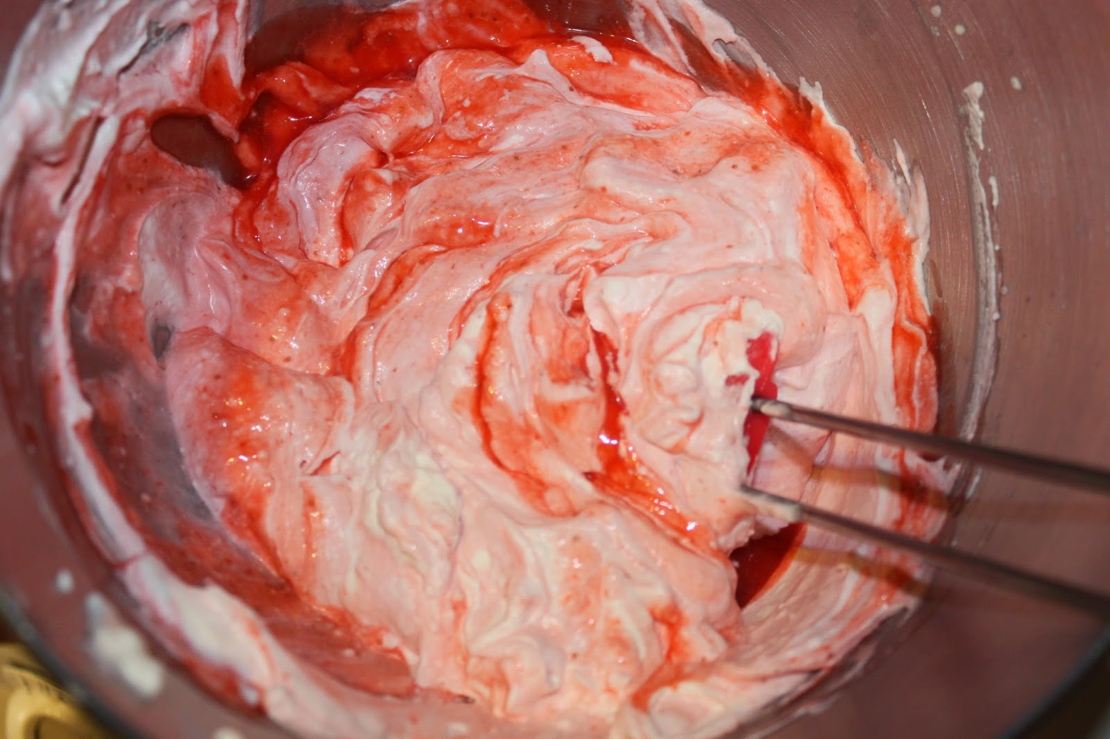 - Montez la crème bien froide en chantilly, ajoutez petit à petit le jus de fraises et en dernier le jus qui contient la gélatine.