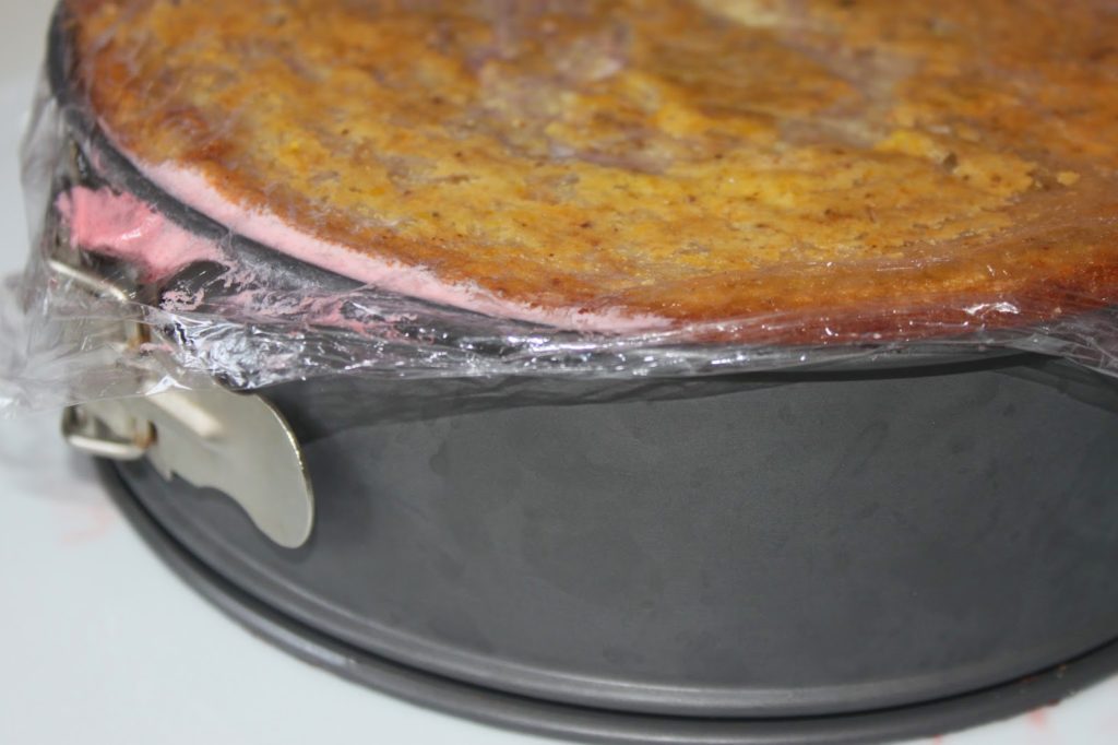 - Le lendemain, passez un coup de sèche cheveux sur le pourtour du moule, retournez-le sur un plat et démoulez. Enlevez la plaque du fond (qui est du coup sur le dessus !) et enlevez le film étirable au dernier moment, juste avant de le dévorer.