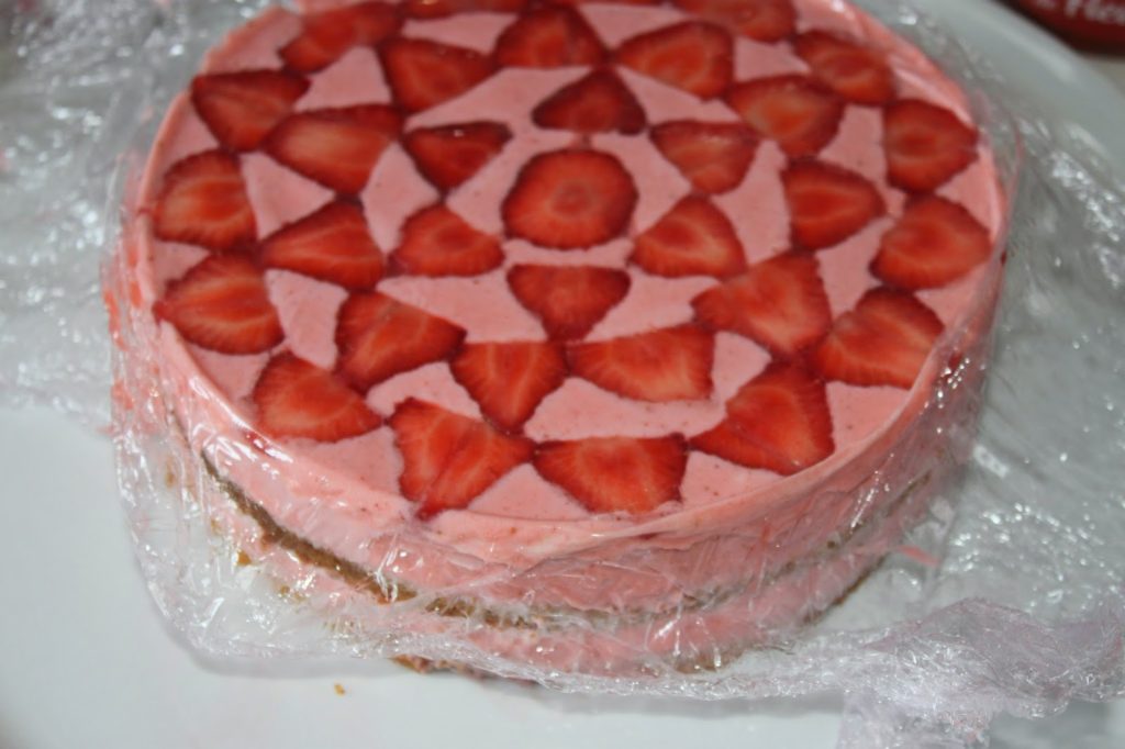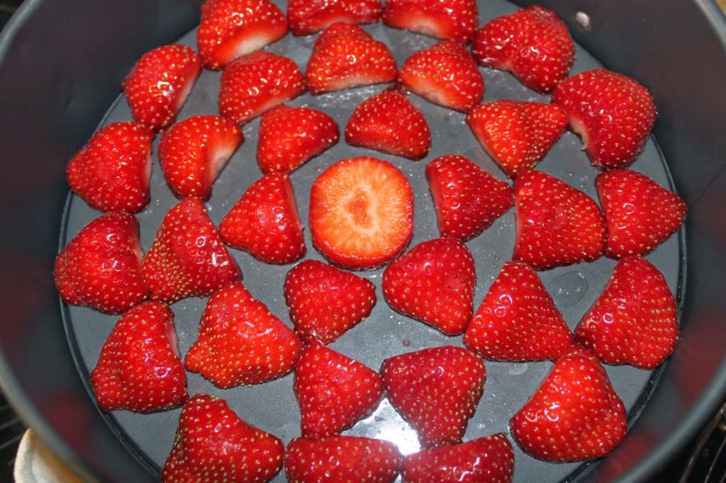 - Mettez un film étirable dans le fond du même moule à manqué de 20cm. Pour qu’il adhère bien et ne fasse pas de plie, j’ai huilé la plaque du fond puis ai posé le film étirable. Placez des fraises dans le fond suivant le décor de votre choix.