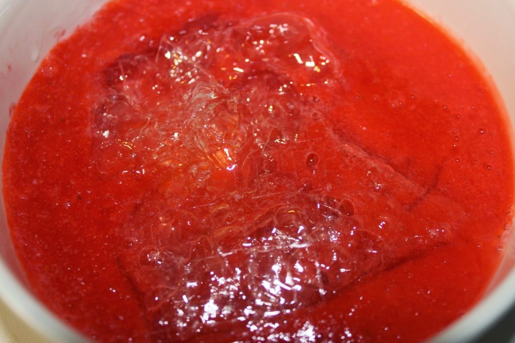 - Prélevez une petite partie (un demi bol) du jus de fraises et faites-le chauffer au four à micro-ondes ou à la casserole. Quand il est bien chaud, ajoutez les feuilles de gélatine essorées.