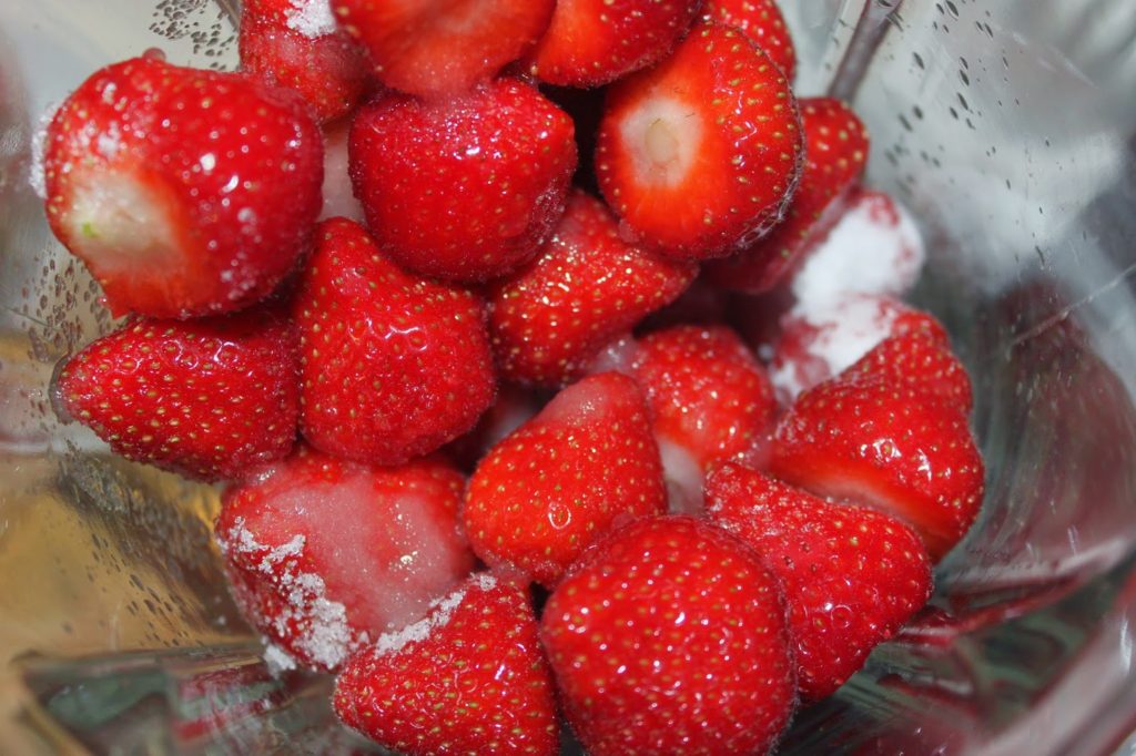 - Mettez les fraises et le sucre avec le jus d’un demi citron dans un blender pour réduire le tout en un jus épais. Faites tremper les feuilles de gélatine dans de l’eau froide.
