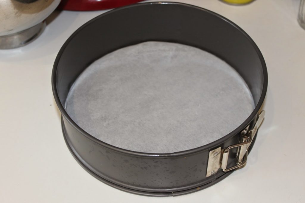 - Préparez votre moule à manqué à bord amovible (si possible) de 20cm de diamètre. Garnissez le fond de papier sulfurisé et graissez légèrement le bord intérieur.