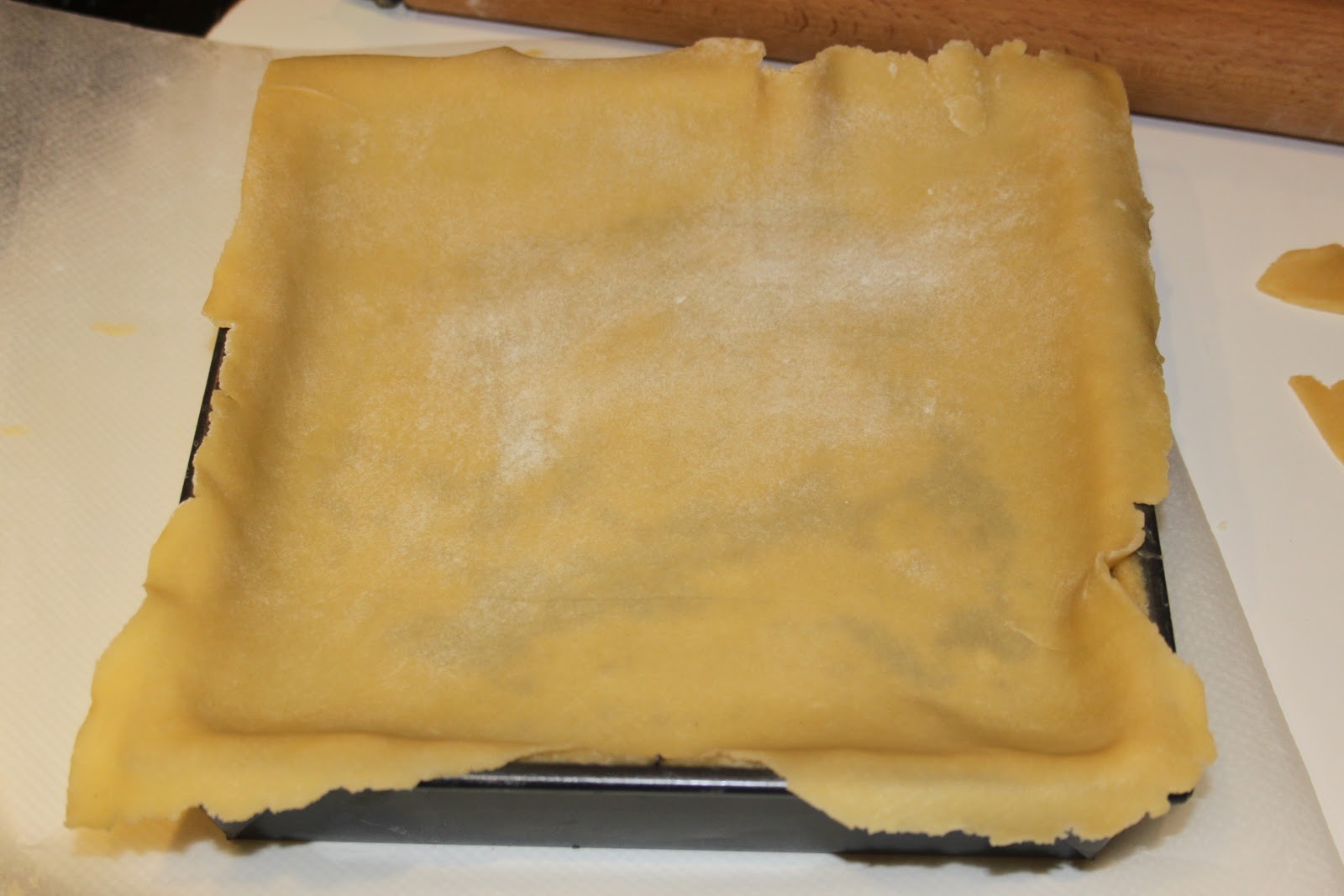 - Sortir du feu et laisser refroidir le temps de foncer le moule avec la pâte. Sortir la pâte du frais, couper en 1/3-2/3, fariner légèrement la boule 2/3 (deux tiers) puis la placer sur un papier sulfurisé. L’étaler assez finement sur une surface correspondant au fond et les côtés du moule.