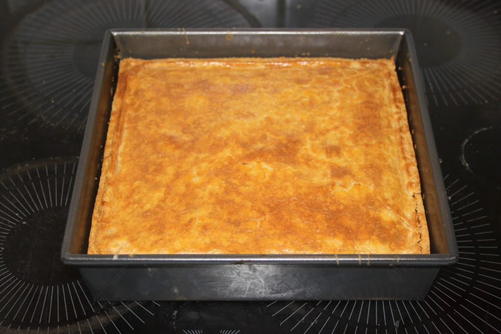 Le gâteau est prêt à passer au four! La farce étant tiède, la pâte va vite ramollir sur le dessus. Pour cette raison, on va faire cuire une quinzaine de minutes avant de passer la dorure à l’oeuf sur la pâte qui du coup, sera ferme et supportera le passage d’un pinceau.