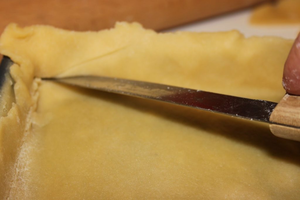 - Bien joindre la pâte du dessus et la pâte du dessous. Couper l’excédent de pâte avec un couteau.