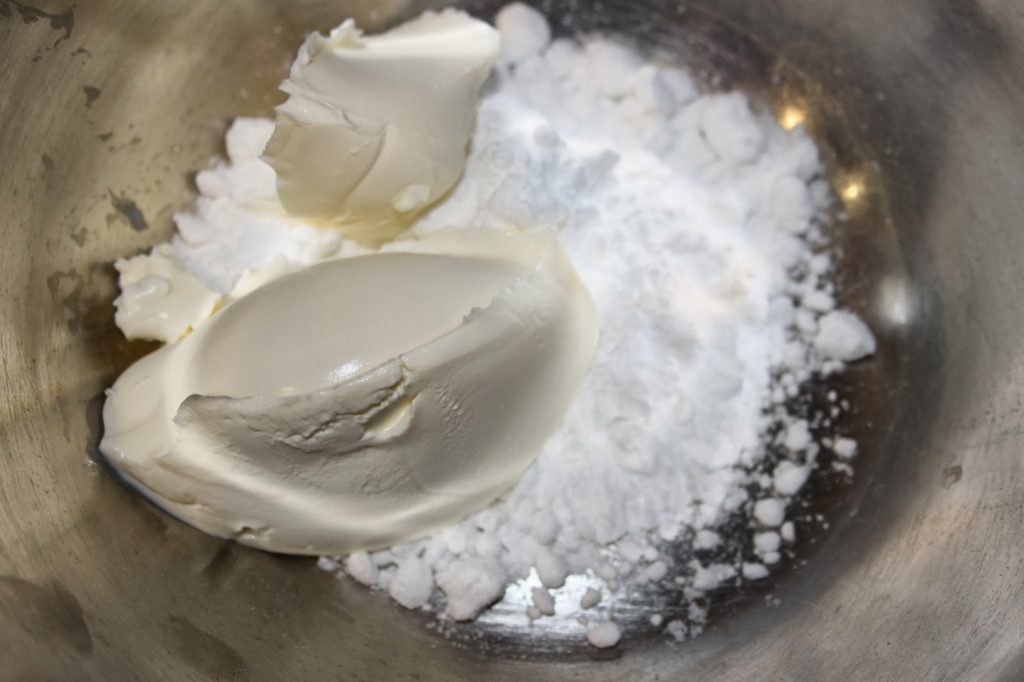 - Préchauffez votre four à 180°C.Mélangez le mascarpone, la crème liquide et le sucre glace.