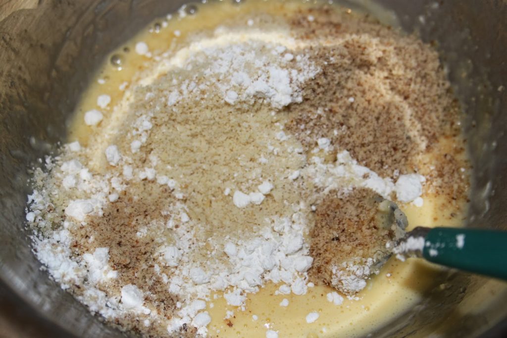 Le tout doit être assez fluide. Versez la poudre d’amandes, la poudre de noisettes et la maïzena.